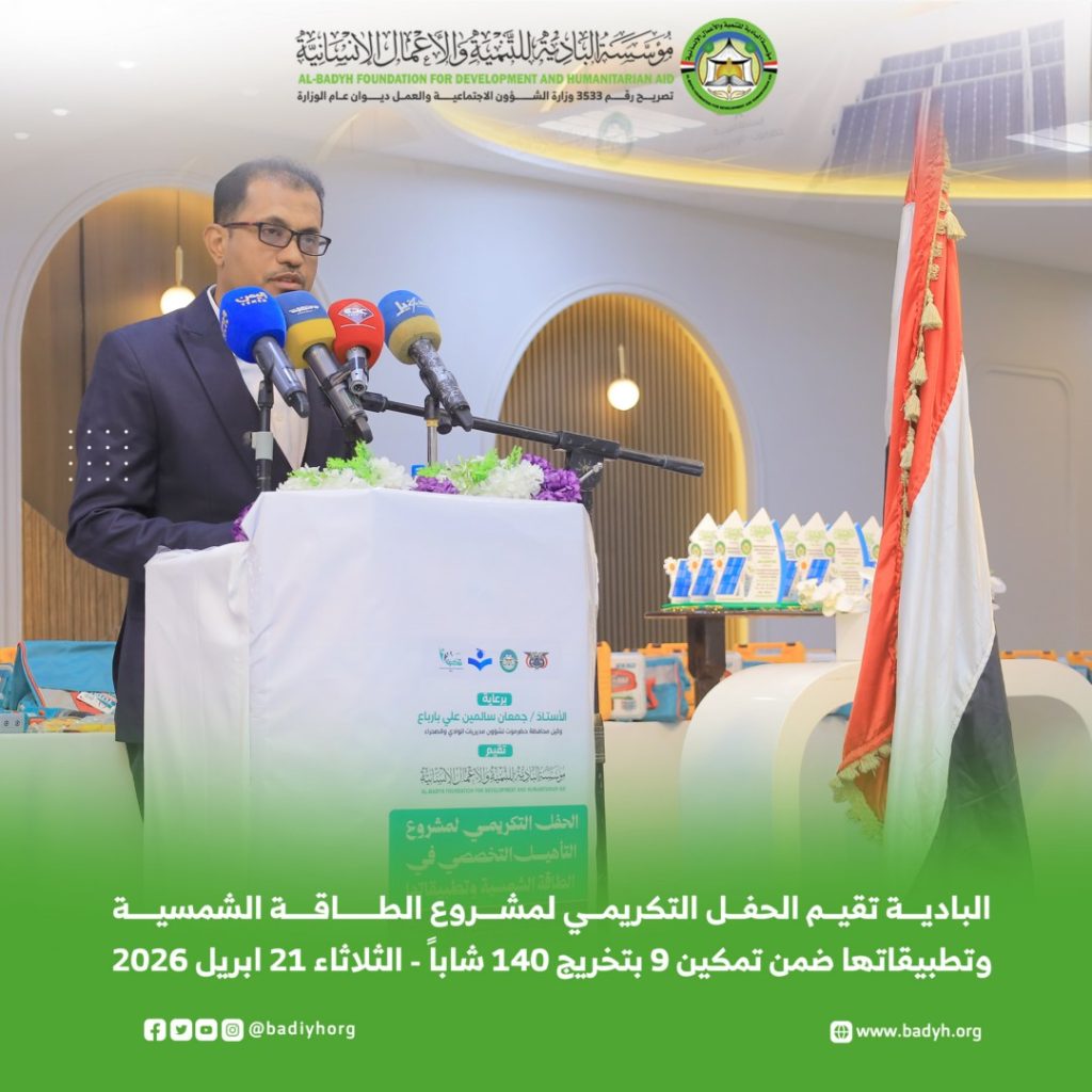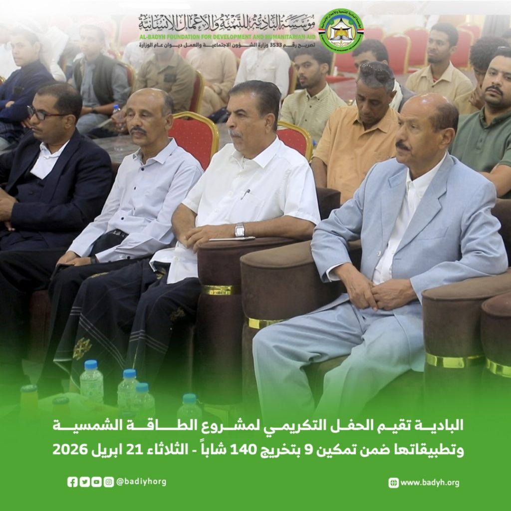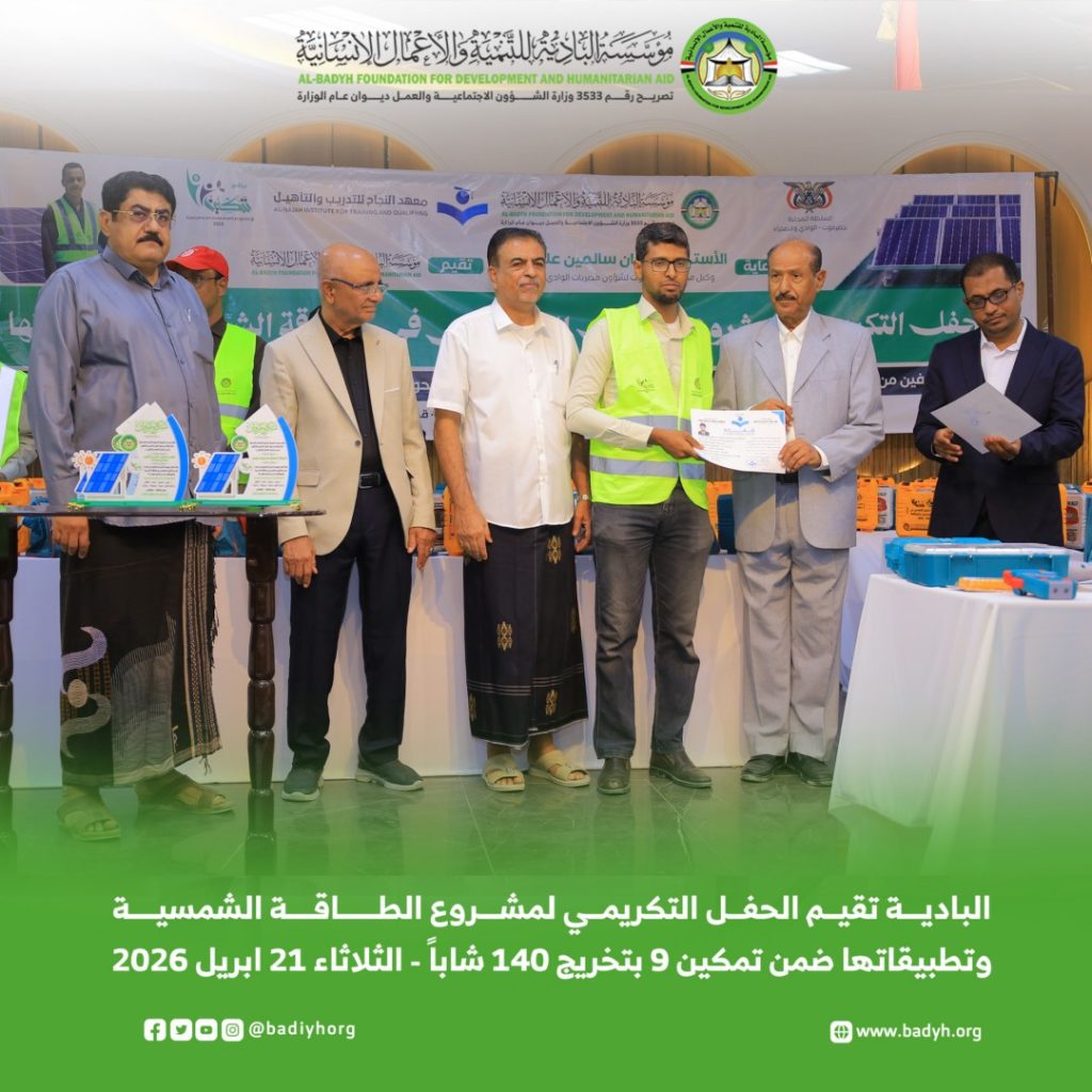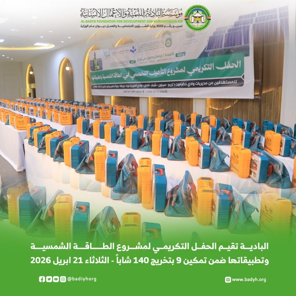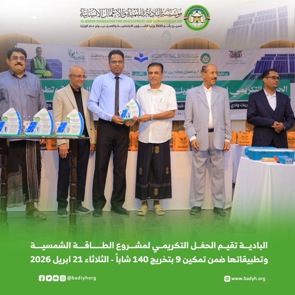 برعاية وكيل محافظة حضرموت لشؤون مديريات الوادي والصحراء الأستاذ/ جمعان سالمين بارباع، أقامت مؤسسة البادية للتنمية والأعمال الإنسانية، اليوم الثلاثاء 21 أبريل 2026م، الحفل التكريمي لمشروع التأهيل التخصصي في الطاقة الشمسية وتطبيقاتها، ضمن برنامج تمكين في نسخته التاسعة، الذي انطلق مطلع مايو 2025م واختتم في يناير 2026م، تحت شعار “استثمار في العقول.. وتمكين لمستقبل مستدام”، بتمويل فاعل خير.