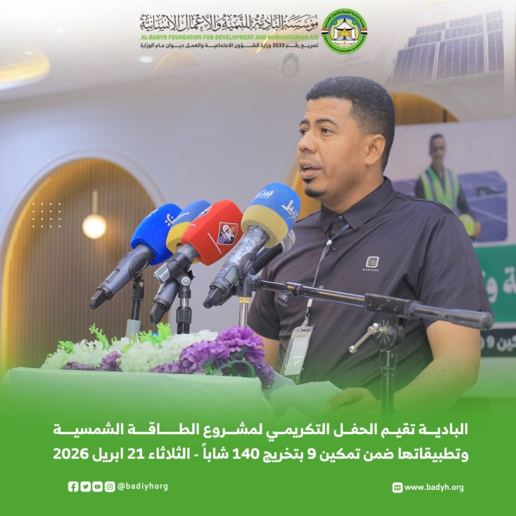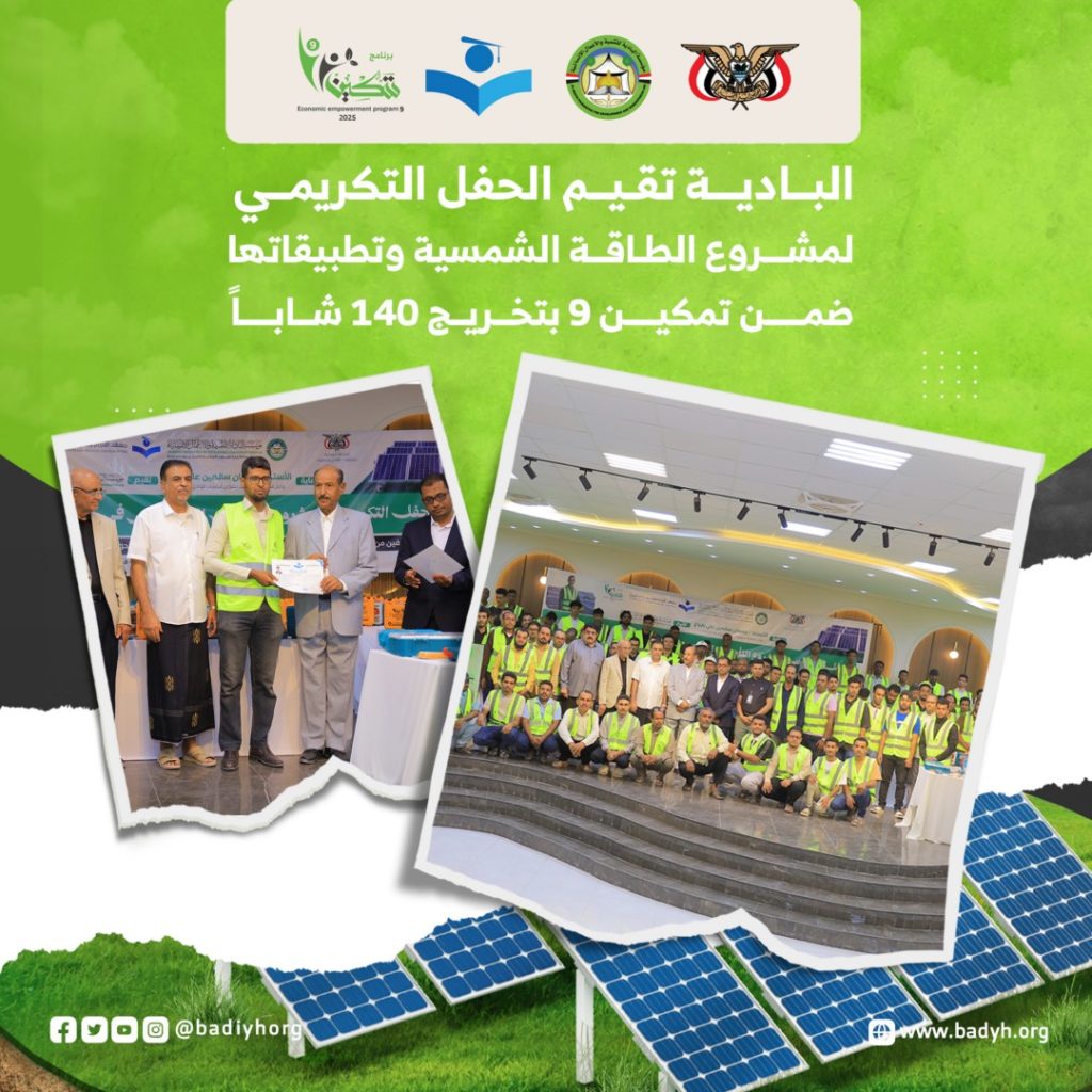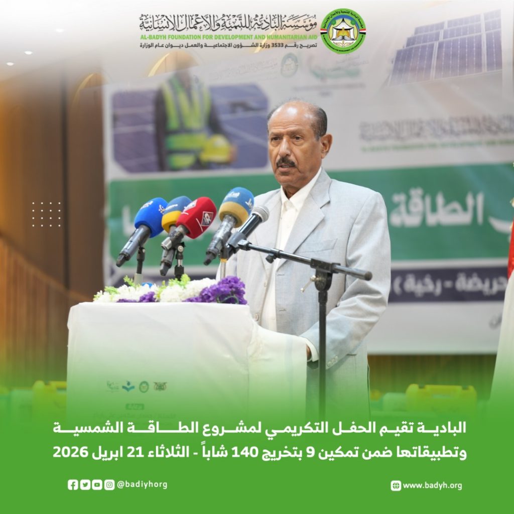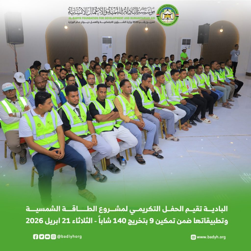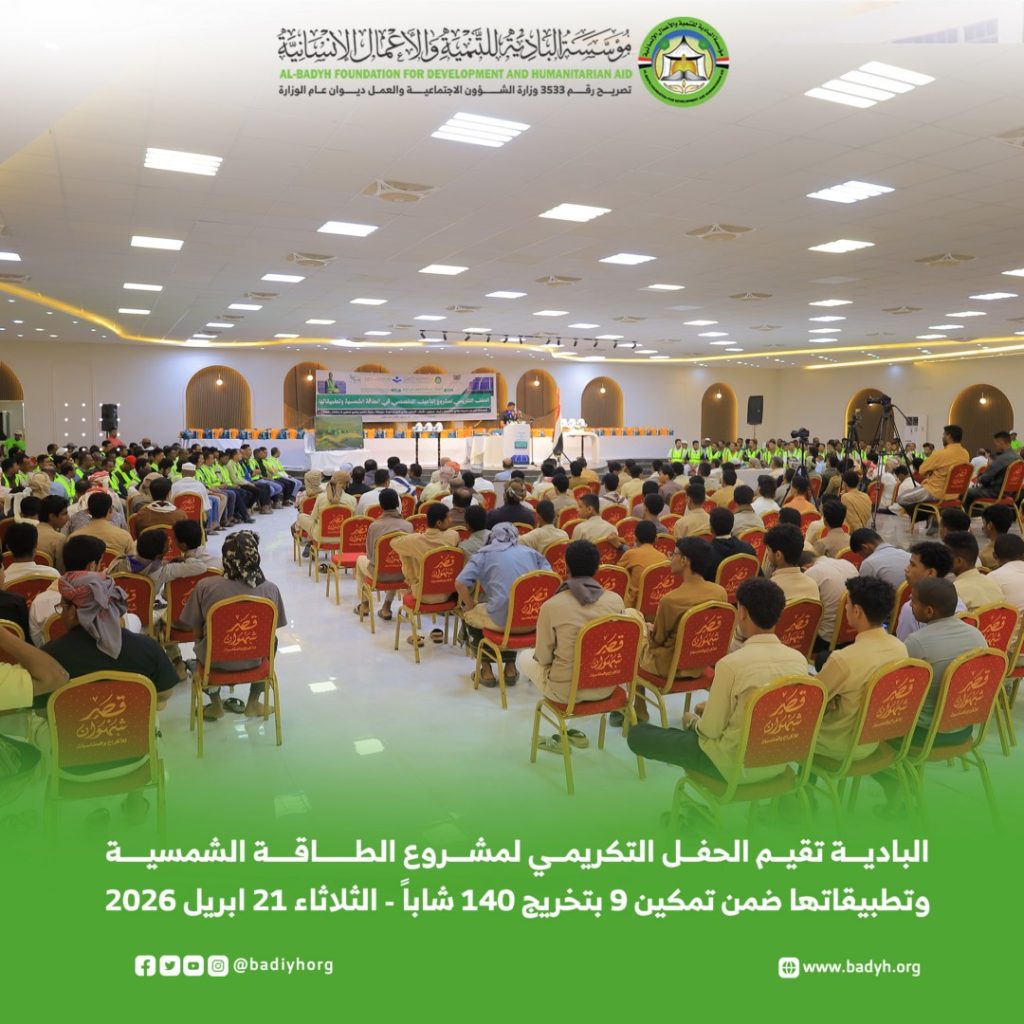 برعاية وكيل محافظة حضرموت لشؤون مديريات الوادي والصحراء الأستاذ/ جمعان سالمين بارباع، أقامت مؤسسة البادية للتنمية والأعمال الإنسانية، اليوم الثلاثاء 21 أبريل 2026م، الحفل التكريمي لمشروع التأهيل التخصصي في الطاقة الشمسية وتطبيقاتها، ضمن برنامج تمكين في نسخته التاسعة، الذي انطلق مطلع مايو 2025م واختتم في يناير 2026م، تحت شعار “استثمار في العقول.. وتمكين لمستقبل مستدام”، بتمويل فاعل خير.