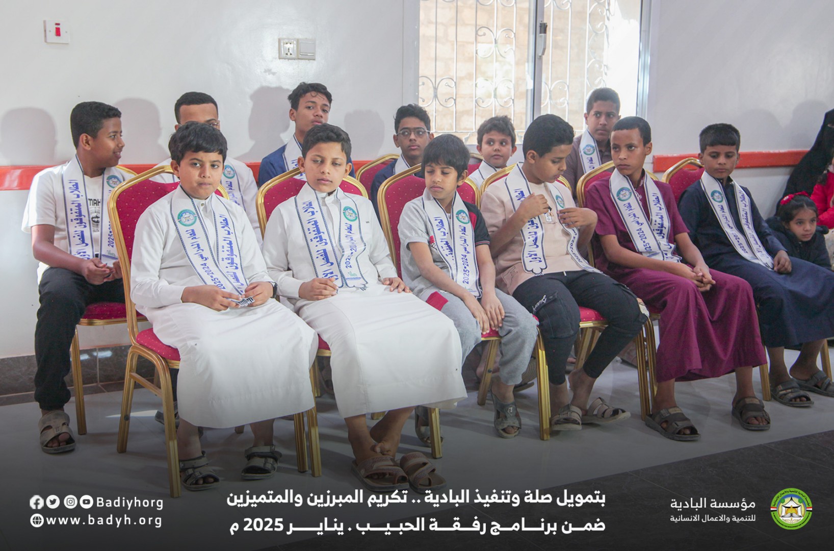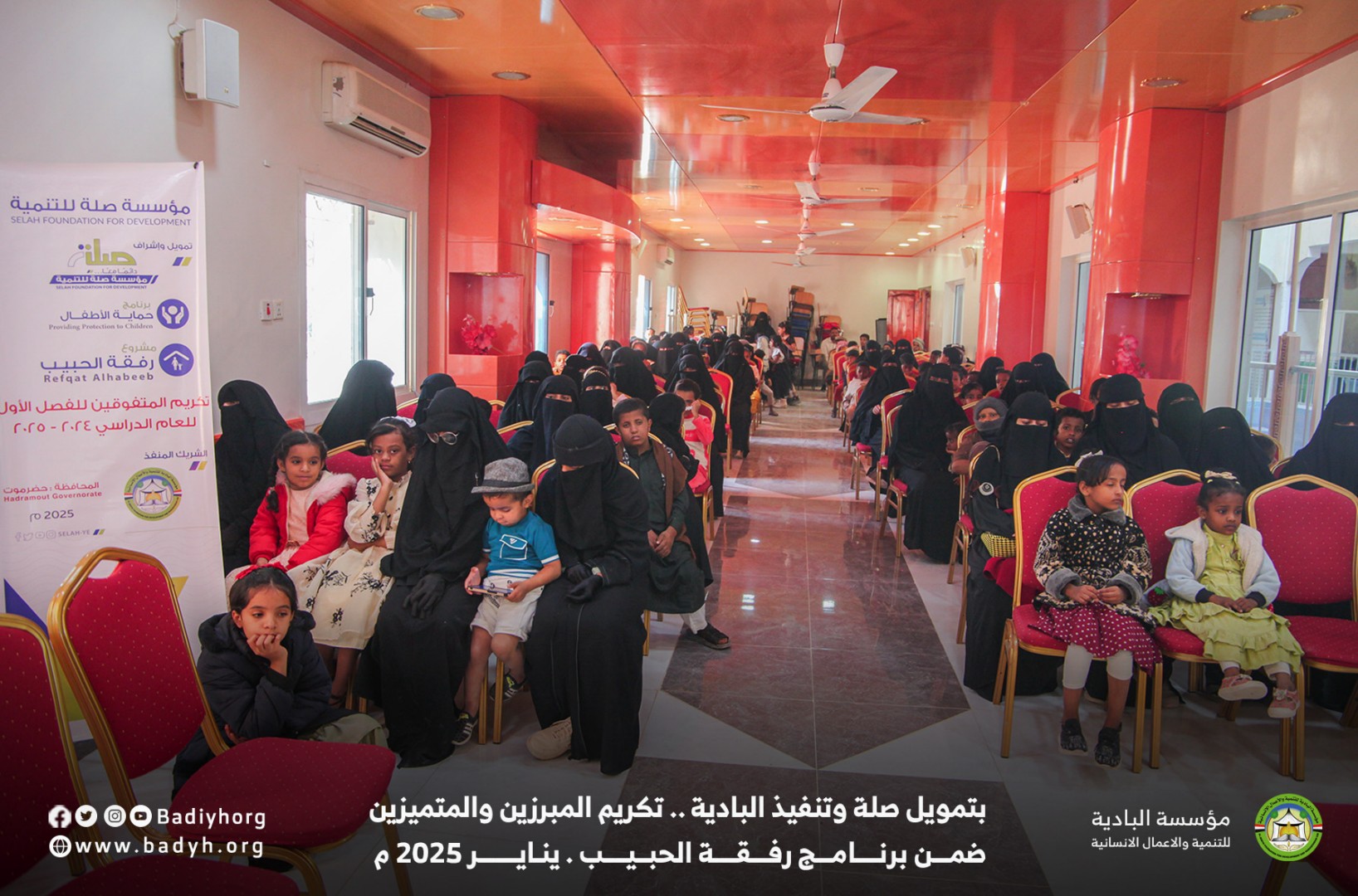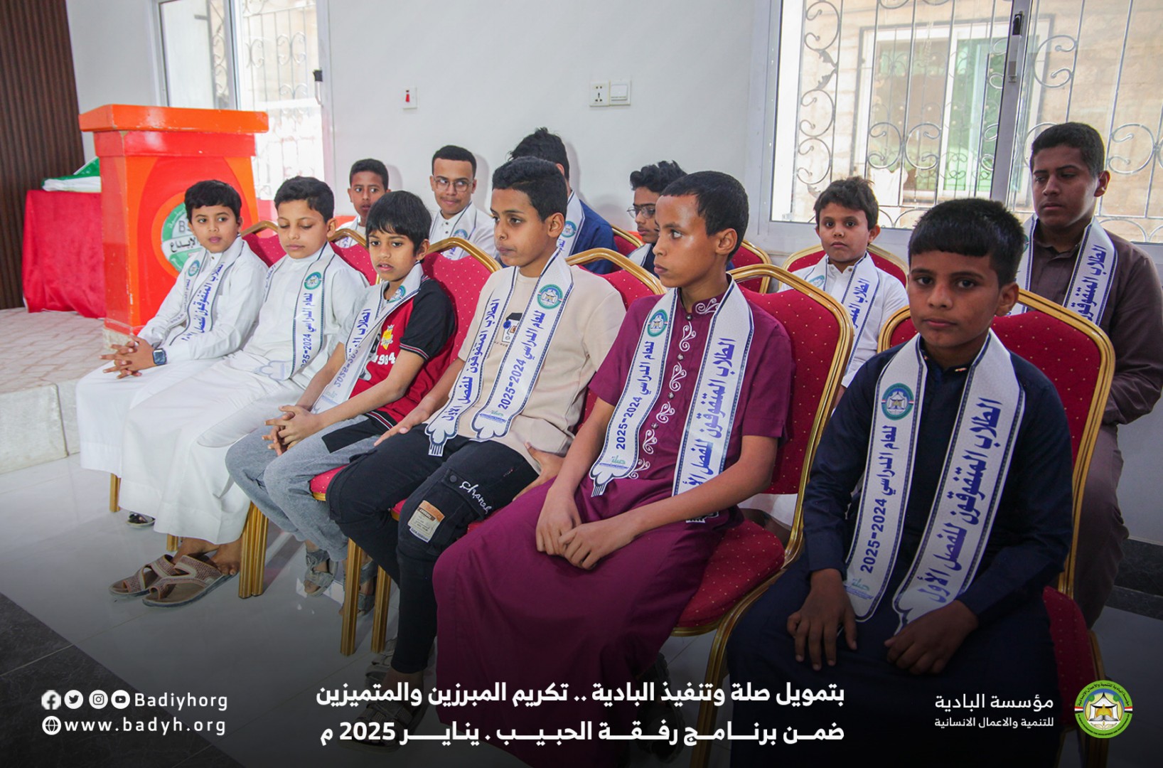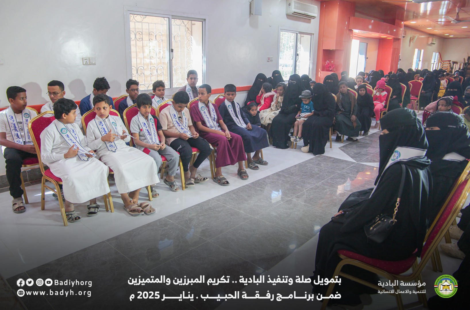 بتمويل كريم من مؤسسة صلة للتنمية كرّمت مؤسسة البادية للتنمية والأعمال الإنسانية المبرزين والمتميزين من الأيتام المكفولين ضمن برنامج رفقة الحبيب للعام 2024-2025،   حيث بلغ عدد المكرمين 60  يتيمًا ويتيمة في مديريتي القطن وسيئون.