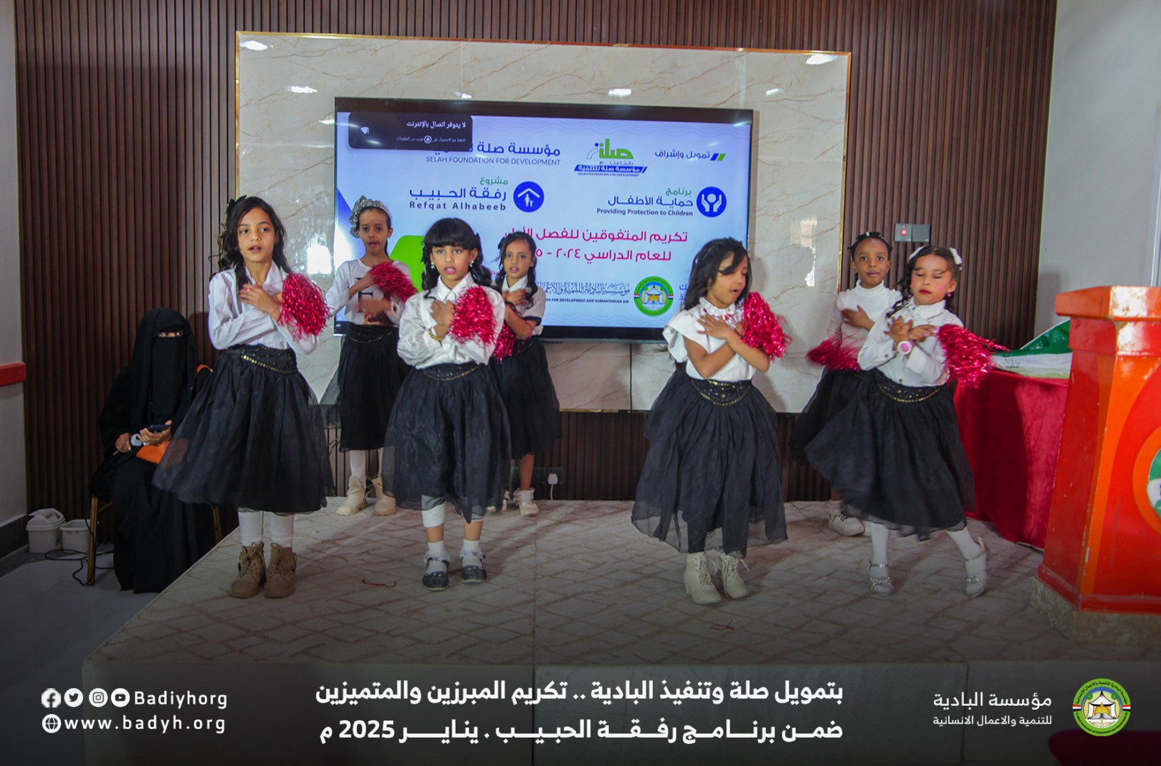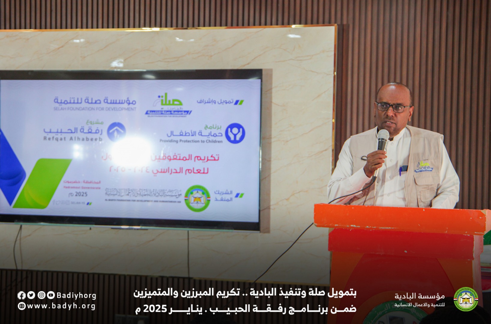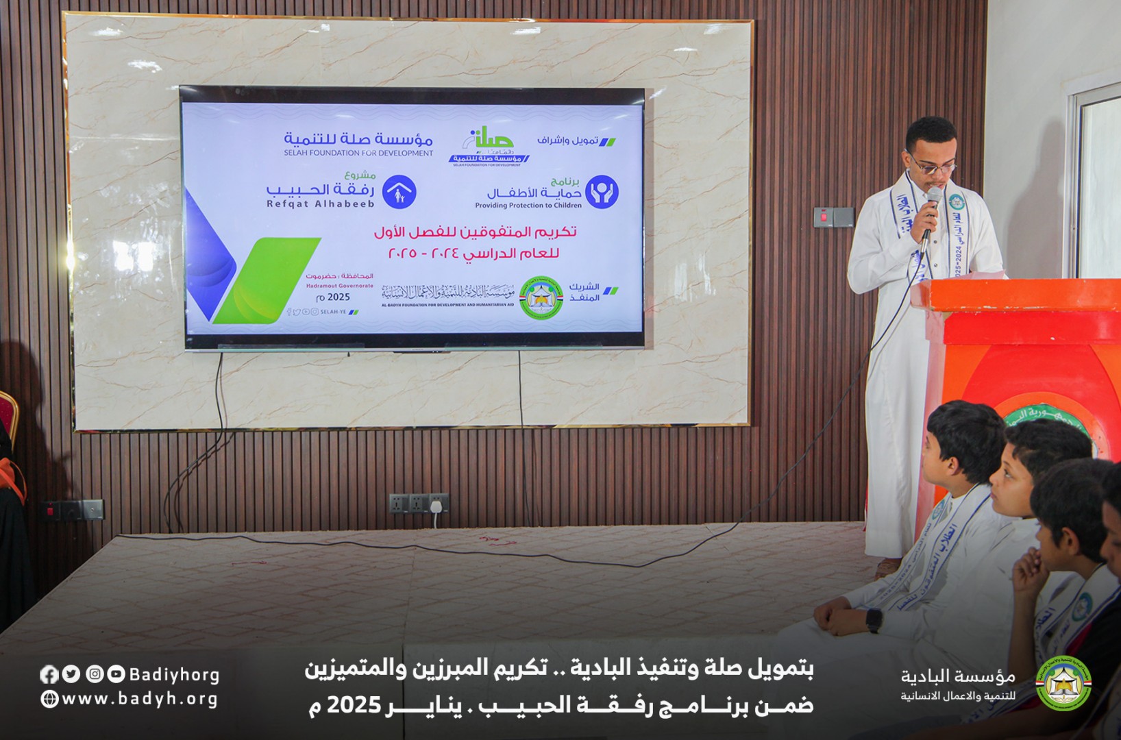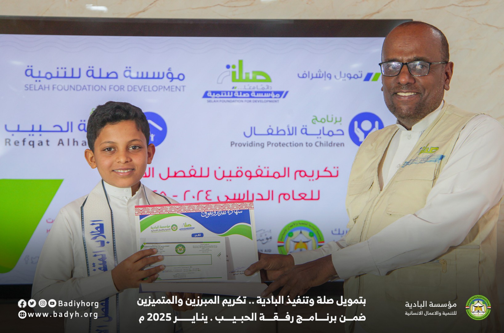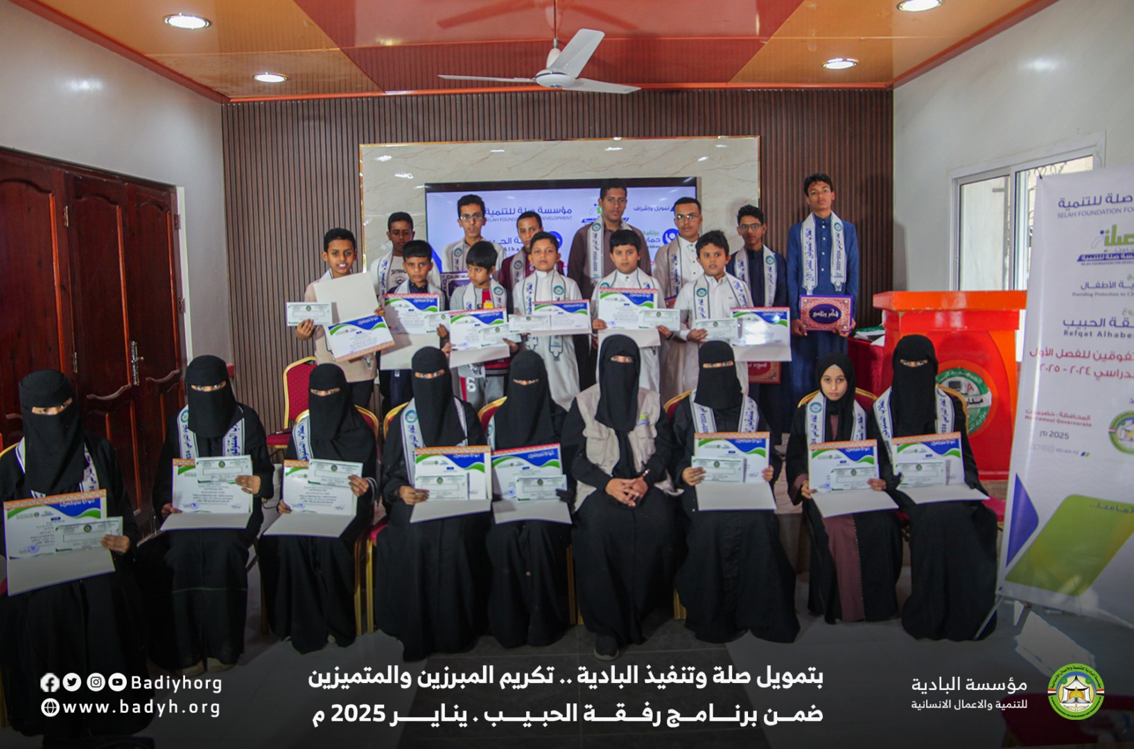 بتمويل كريم من مؤسسة صلة للتنمية كرّمت مؤسسة البادية للتنمية والأعمال الإنسانية المبرزين والمتميزين من الأيتام المكفولين ضمن برنامج رفقة الحبيب للعام 2024-2025،   حيث بلغ عدد المكرمين 60  يتيمًا ويتيمة في مديريتي القطن وسيئون.