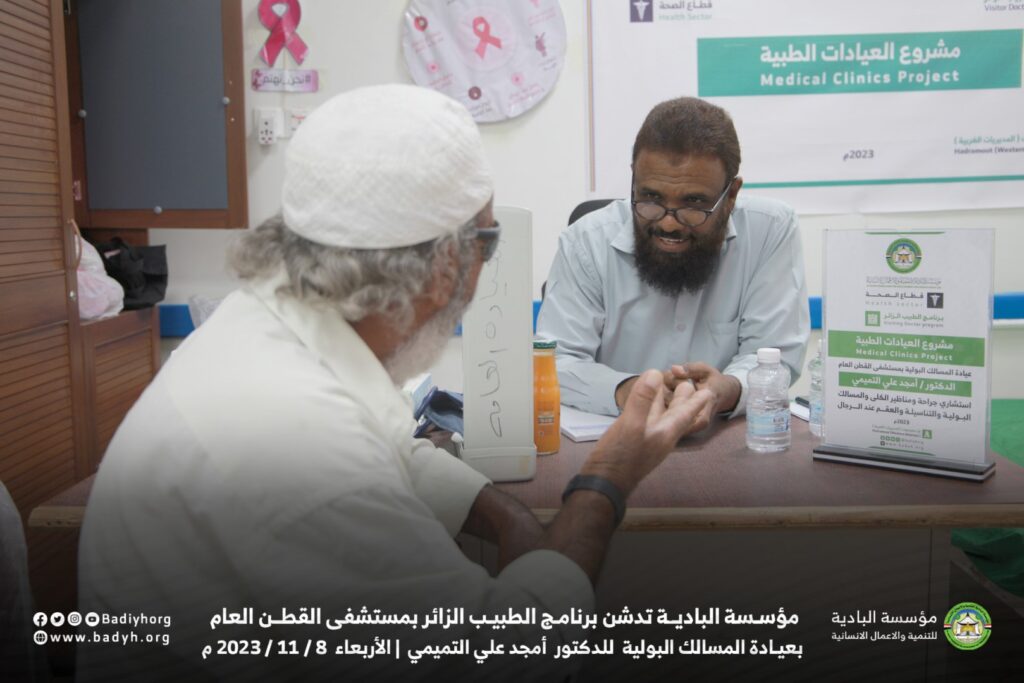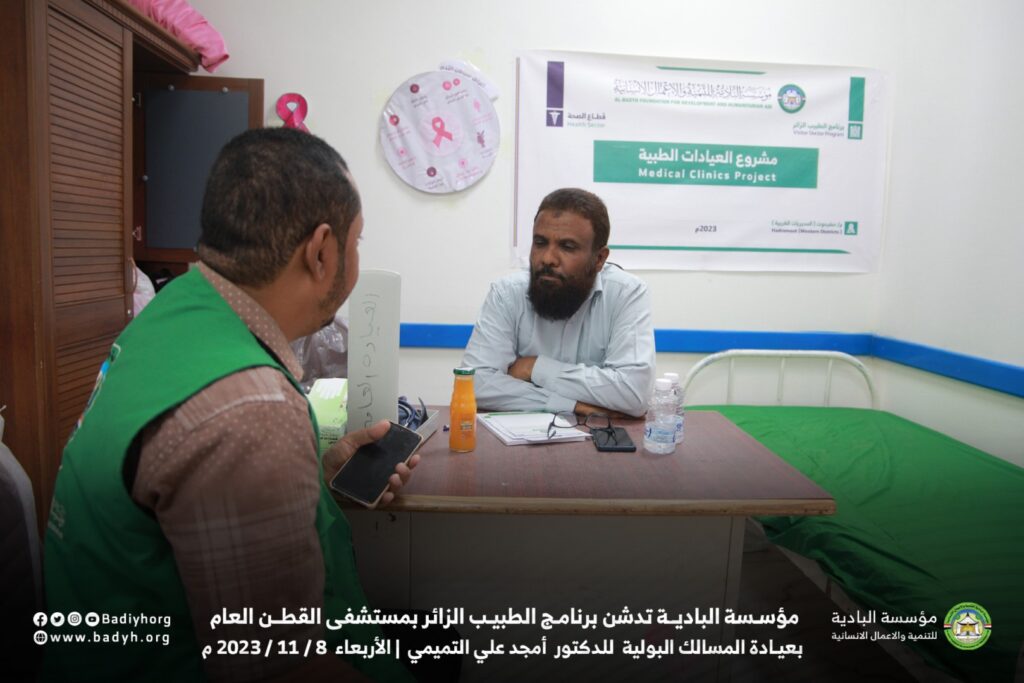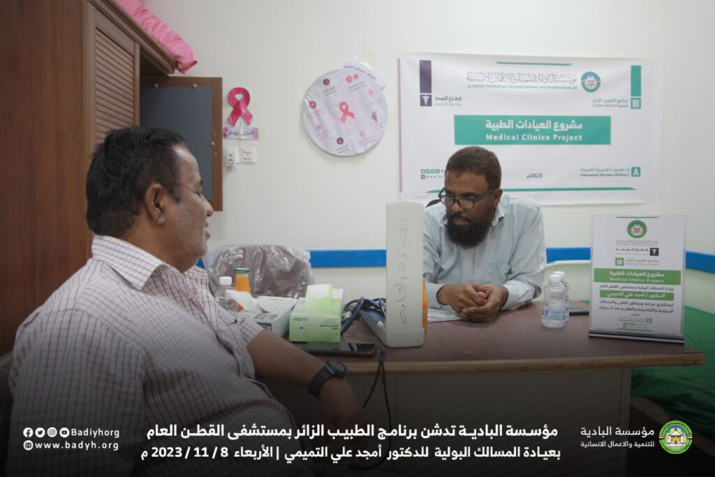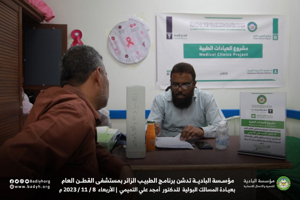 دشنت مؤسسة البادية للتنمية والأعمال الإنسانية اليوم الأربعاء 8 / 11 / 2023 م برنامج الطبيب الزائر بأول عيادة طبية وهي عيادة المسالك البولية بمستشفى القطن العام .