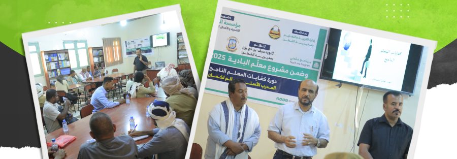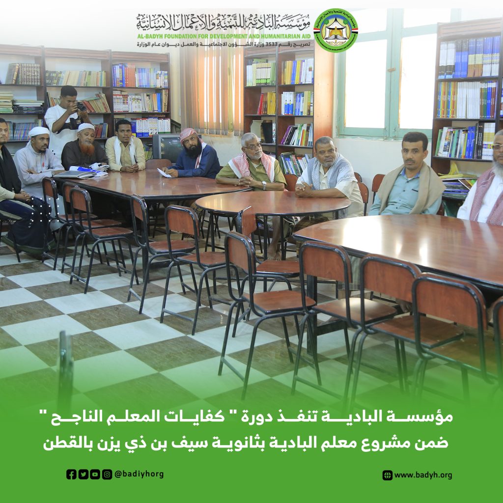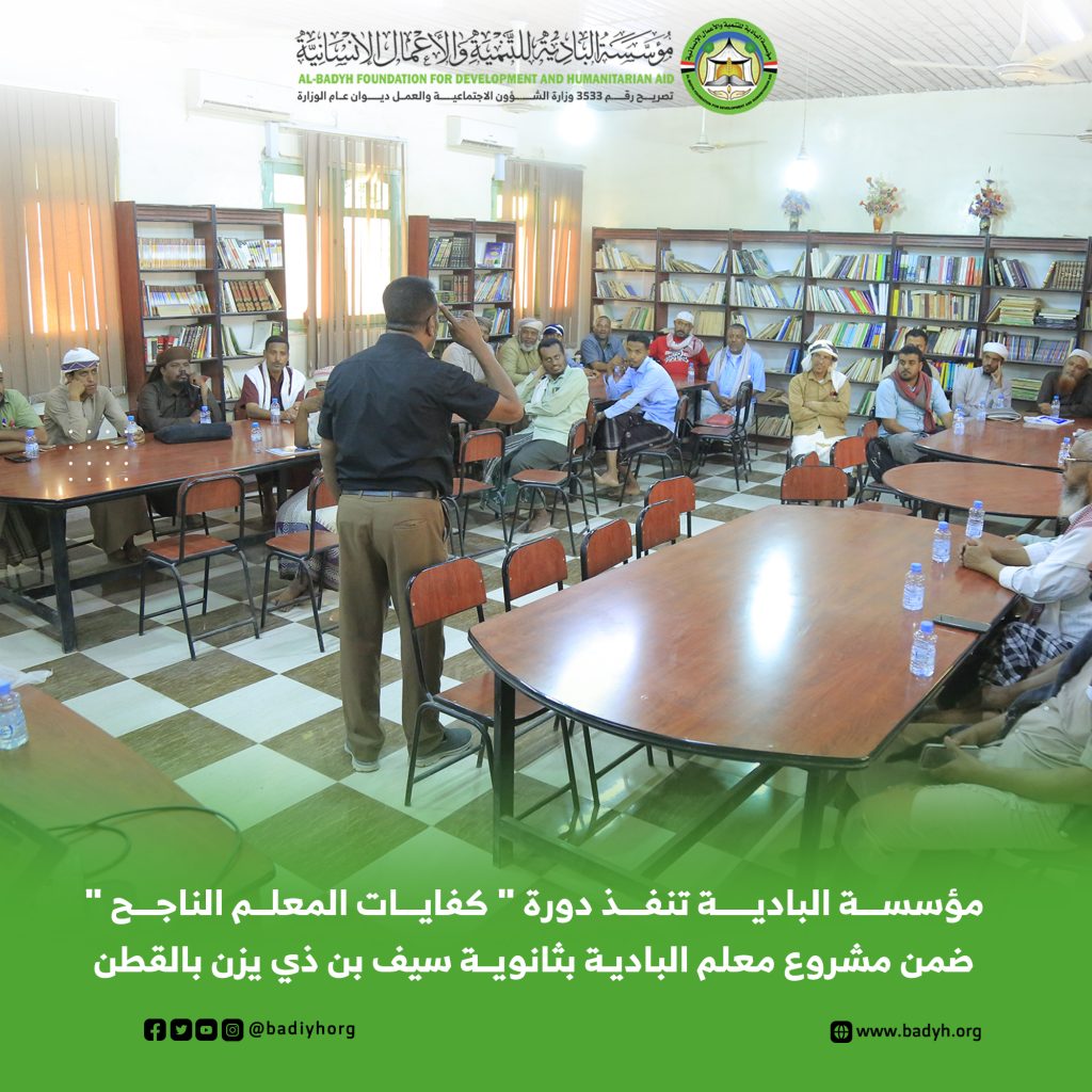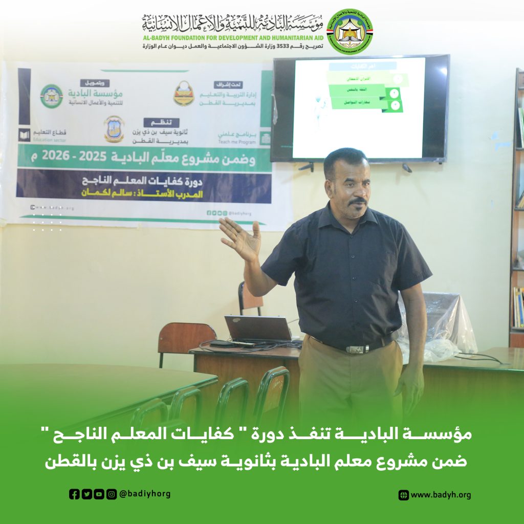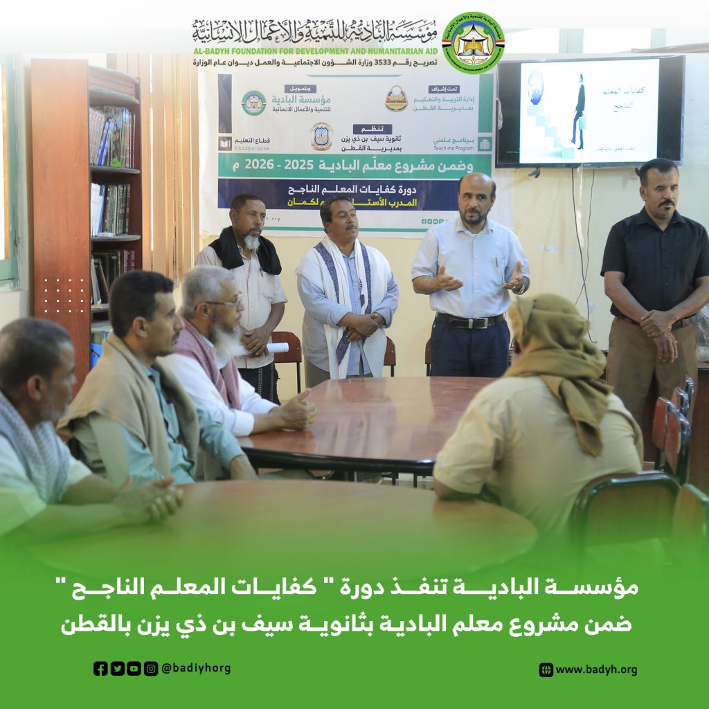 ضمن مشروع “معلم البادية” الهادف إلى دعم العملية التعليمية وتعزيز كفاءة الكادر التربوي، نفذت مؤسسة البادية للتنمية والأعمال الإنسانية دورة تدريبية بعنوان “كفايات المعلم الناجح” في ثانوية سيف بن ذي يزن بمديرية القطن، بمشاركة عدد من معلمي الثانوية، وبإشراف إدارة التربية والتعليم بمديرية القطن.