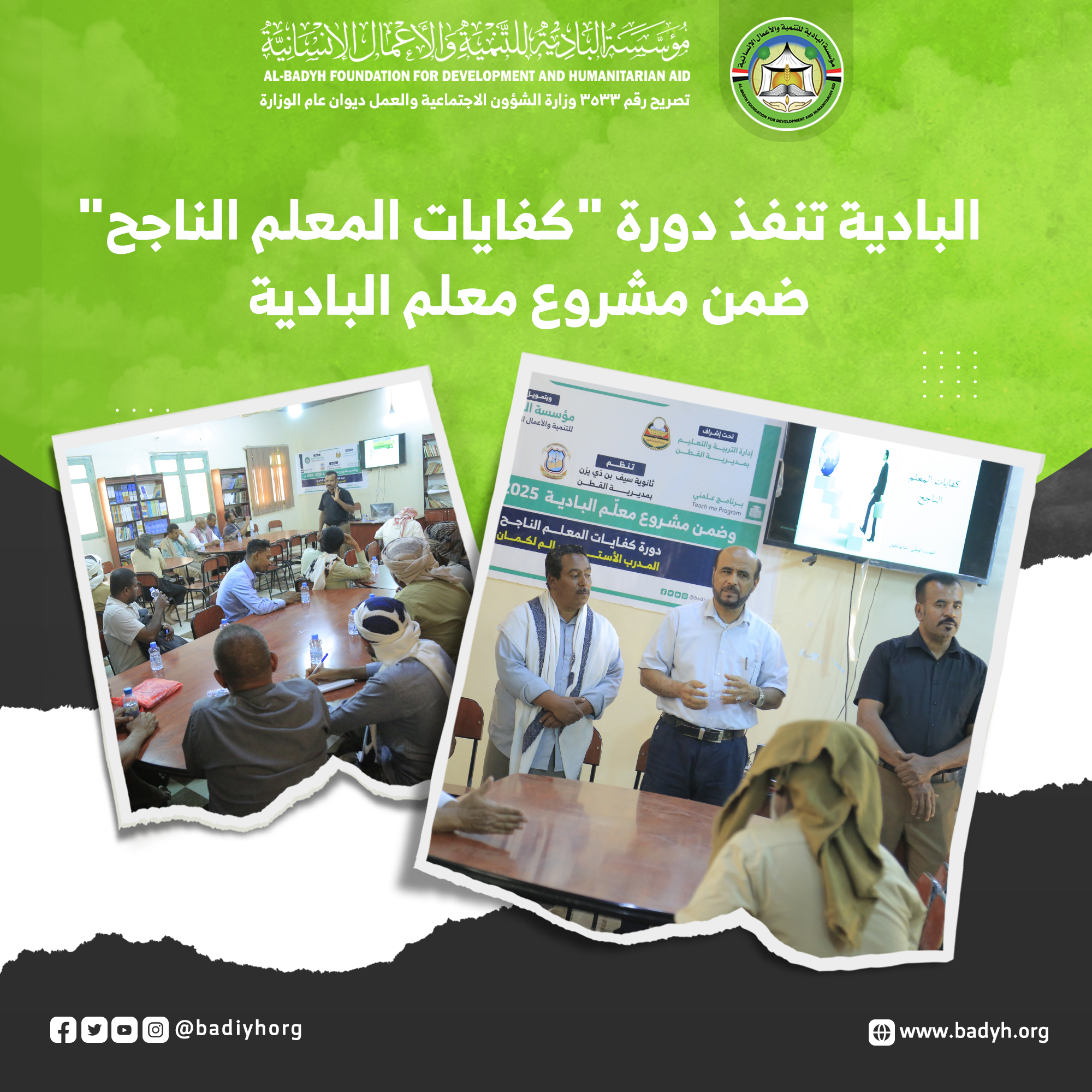 مؤسسة البادية تنفذ دورة كفايات المعلم الناجح ضمن مشروع معلم البادية بثانوية سيف بن ذي يزن بالقطن